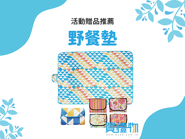 戶外活動絕對不能少了野餐墊,無論是休息、用餐、聊天,當四周沒有座椅可以使用時,只要一塊野餐墊就能解決,席地而坐也能增加參加者之間的互動,增加活動的熱鬧感。既實用又好攜帶,是活動贈品的熱門選擇。